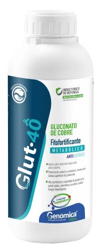 Glut-40 es un FITOFORTIFICANTE a base de cobre en forma de Gluconato de Cobre que aumenta la asimilación, traslocación de este mineral en la planta, su fuente de cobre acomplejado con ácido glutámico, potencia la asimilación para aplicación vía foliar o fertirriego. siendo así una fuente de rápida asimilación para suplir este elemento y contrarrestar deficiencias relacionadas con clorosis debidas a carencias de este elemento con respecto a las concentraciones optimas requeridas en cada cultivo.
