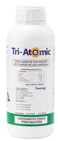 Tri-Atomic, está compuesto por citoquinínas (kinetina y bencil-amino-purina), giberelínas (A.G. 3) y auxínas (acido indol acético), provenientes de extractos vegetales, enriquecidos con L-aminoácidos, carbohidratos activos, entre otras sustancias de alta actividad biológica de origen orgánico, que actúan fisiológicamente como reguladores de crecimiento en todas las etapas del desarrollo fenológico de los cultivos.
